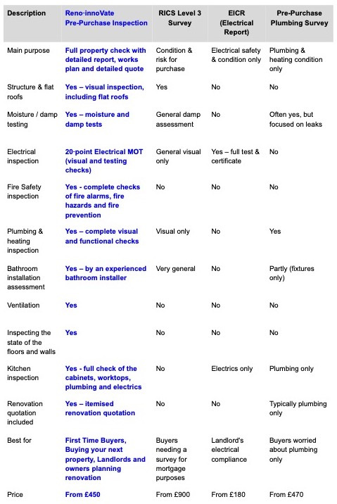 Reno‑innoVate Pre-Inspection vs. RICS Building Survey vs. EICR vs Plumbing Survey
